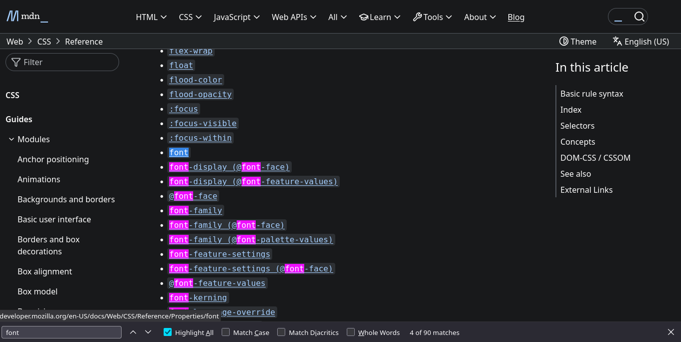Now, let’s look at Mozilla Developer Network’s (MDN) CSS reference docs. CSS defines the style and visual appearance of websites, and docs on this topic are quite overwhelming. This guide contains CSS’ numerous properties and values, as well as a lot of information about each. However, if we want to know how to change the font properties of a particular piece of text, we can simply ctrl + f “font” to find all the relevant information: