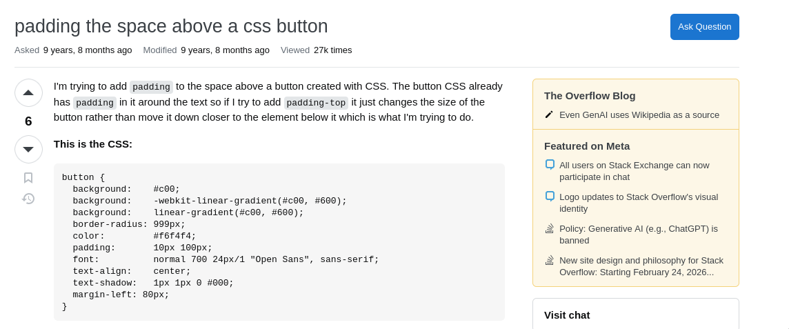 Let’s say we typed the following in a search engine: “create space around a button css”. As is typical with many search results, the first hit of this query is not actually pointing us to any documentation, but rather to this Stack Overflow question.