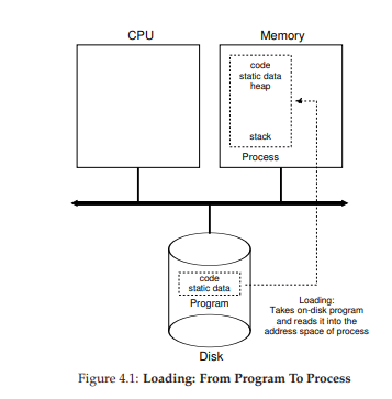 Bước đầu tiên mà hệ điều hành phải thực hiện là load mã lệnh (code) và static data (ví dụ: các biến đã khởi tạo) của chương trình vào bộ nhớ, trong không gian địa chỉ (address space) của process. Ban đầu, chương trình nằm trên đĩa (hoặc, trong nhiều hệ thống hiện đại, ổ SSD dạng flash) dưới một định dạng excecute. Do đó, việc load chương trình và static data vào bộ nhớ đòi hỏi hệ điều hành phải đọc các byte từ đĩa và đặt chúng vào một vị trí nào đó trong bộ nhớ (như minh họa trong Hình 4.1).
