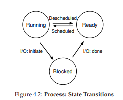 - Các process tồn tại ở một trong nhiều trạng thái process khác nhau, bao gồm đang chạy (running), sẵn sàng chạy (ready to run), và bị chặn (blocked). Các sự kiện khác nhau (ví dụ: được lập lịch để chạy hoặc bị rút khỏi CPU, hoặc chờ một thao tác I/O hoàn tất) sẽ chuyển một process từ trạng thái này sang trạng thái khác.