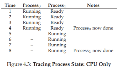 Ví dụ: giả sử có hai process chạy, cả hai chỉ dùng CPU (không I/O). Dấu vết trạng thái (trace) của chúng sẽ giống như Hình 4.3.