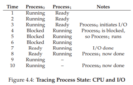 Cụ thể, Process0 thực hiện một yêu cầu I/O và bị chặn để chờ kết quả; điều này thường xảy ra khi đọc từ đĩa hoặc chờ gói tin mạng. Hệ điều hành nhận thấy Process0 không dùng CPU, nên lập lịch chạy Process1. Trong khi Process1 chạy, I/O hoàn tất, Process0 chuyển về trạng thái ready. Khi Process1 kết thúc, Process0 được chạy tiếp cho đến khi hoàn thành.