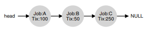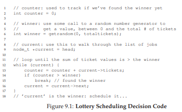 Để đưa ra quyết định lập lịch, trước tiên chúng ta phải chọn một số ngẫu nhiên (winner) từ tổng số ticket (400)^[2]. Giả sử chúng ta chọn số 300. Sau đó, ta chỉ cần duyệt qua danh sách, sử dụng một biến đếm (counter) đơn giản để giúp tìm ra ticket thắng (Hình 9.1).