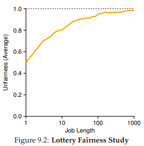 Hình 9.2 biểu diễn đồ thị giá trị công bằng trung bình khi thay đổi độ dài R của hai job từ 1 đến 1000, qua 30 lần thử (kết quả được tạo bởi trình mô phỏng ở cuối chương). Như bạn thấy, khi thời gian chạy của job ngắn, công bằng trung bình có thể khá thấp. Chỉ khi các job chạy qua nhiều time slice, lottery scheduler mới tiến gần đến kết quả công bằng mong muốn.