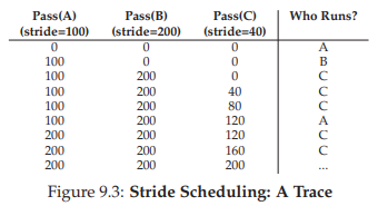 Stride scheduling cũng khá đơn giản: mỗi job trong hệ thống có một stride, tỷ lệ nghịch với số ticket mà nó có. Trong ví dụ trước, với A, B, C lần lượt có 100, 50 và 250 ticket, ta tính stride bằng cách lấy một số lớn chia cho số ticket. Nếu lấy 10.000 chia cho số ticket, ta được stride của A, B, C lần lượt là 100, 200 và 40.