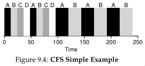 Ví dụ: n = 4 → mỗi process có 12 ms. CFS chạy job đầu tiên 12 ms, rồi chọn job có vruntime thấp nhất tiếp theo. Trong Hình 9.4, 4 job (A, B, C, D) mỗi job chạy 2 time slice; sau đó C, D hoàn thành, A và B chạy luân phiên 24 ms.