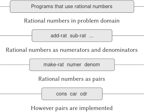 Ý tưởng cơ bản của data abstraction là cấu trúc các chương trình sẽ sử dụng các đối tượng dữ liệu phức hợp sao cho chúng hoạt động trên “abstract data” (dữ liệu trừu tượng). Nghĩa là, chương trình của chúng ta nên sử dụng dữ liệu theo cách không đưa ra các giả định về dữ liệu ngoài những gì thực sự cần thiết để thực hiện nhiệm vụ. Đồng thời, một “concrete” data representation (biểu diễn dữ liệu cụ thể) được định nghĩa độc lập với các chương trình sử dụng dữ liệu đó. Giao diện giữa hai phần này của hệ thống sẽ là một tập hợp các procedure, gọi là selectors (bộ chọn) và constructors (bộ tạo), dùng để hiện thực dữ liệu trừu tượng dựa trên biểu diễn cụ thể. Để minh họa kỹ thuật này, chúng ta sẽ xem xét cách thiết kế một tập hợp các procedure để thao tác với rational numbers (số hữu tỉ).