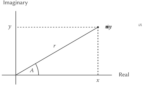 Khi nhân complex numbers (số phức), cách tự nhiên hơn là nghĩ đến việc biểu diễn một complex number ở dạng polar form (dạng cực), như một magnitude (độ lớn) và một angle (góc) ($r$ và $A$ trong Hình 2.20). Tích của hai complex numbers là véc-tơ thu được bằng cách kéo giãn một complex number theo độ dài của số kia và sau đó quay nó theo góc của số kia: