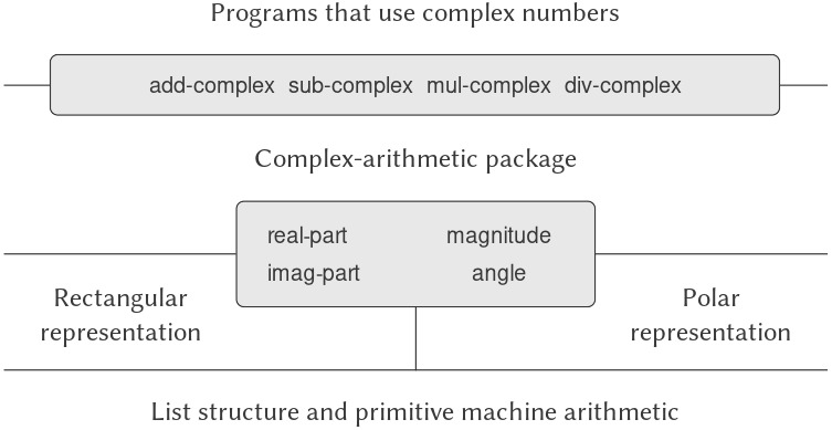 Hệ thống complex-number thu được, như trong Hình 2.19, chứa hai loại abstraction barrier khác nhau. Các abstraction barrier “ngang” đóng vai trò giống như trong Hình 2.1: chúng tách biệt các phép toán “cấp cao” khỏi các biểu diễn “cấp thấp”. Ngoài ra, còn có một barrier “dọc” cho phép chúng ta thiết kế và cài đặt riêng biệt các cách biểu diễn thay thế.