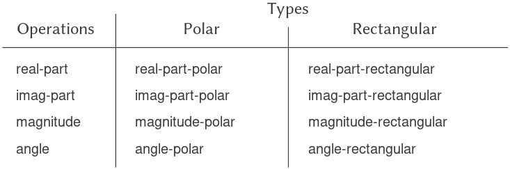 Các selector (bộ chọn) của complex-arithmetic (số học phức) truy cập bảng thông qua một procedure (thủ tục) “operation” (phép toán) tổng quát gọi là apply-generic