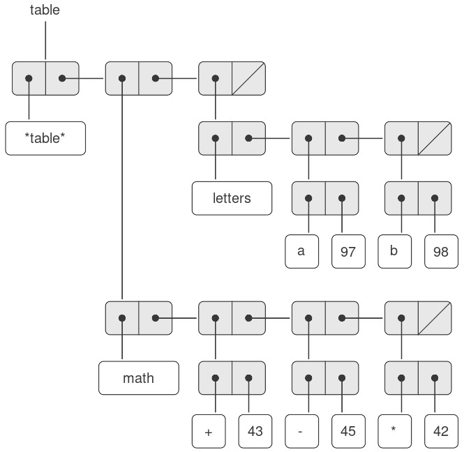 Trong cấu trúc này, các pairs trong hai danh sách (a b)