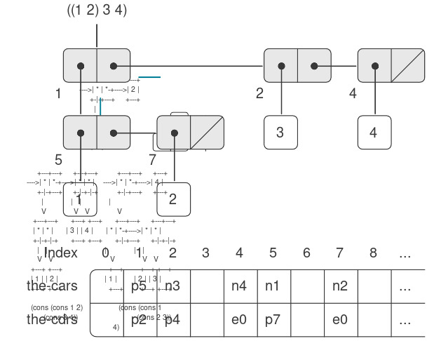 . Trong sơ đồ box-and-pointer, chúng ta đã chỉ ra ở góc dưới bên trái của mỗi pair chỉ số vector xác định nơi lưu trữ car