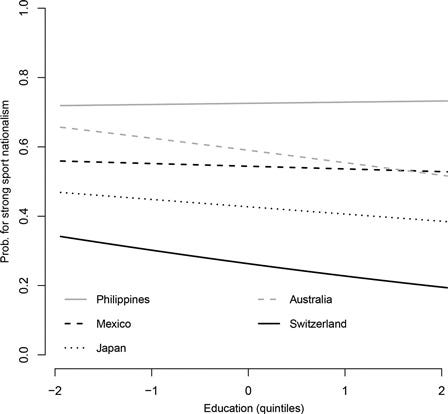 Ở đây tôi muốn tập trung nói về tỉ lệ nghịch giữa trình độ học thức và chủ nghĩa dân tộc thể thao. Biểu đồ trên cho thấy cá nhân càng được giáo dục cao thì tinh thần dân tộc thể thao càng thấp, đồng thời cũng cho thấy các nước phát triển (như Thuỵ Sĩ, đường dưới cùng biểu đồ, tức tinh thần dân tộc thể thao thấp nhất) có mức độ chủ nghĩa dân tộc thể thao thấp hơn các nước kém phát triển (như Philippines, đường trên cùng, tinh thần cao nhất). Ngoài ra cần xem xét đến mức độ ảnh hưởng của giáo dục tuỳ theo nước, nước giàu như Thuỵ Sĩ tác động của giáo dục rất lớn, trong khi nước nghèo như Philippines và Mexico tác động gần như không, đường đồ thị gần như chạy ngang.