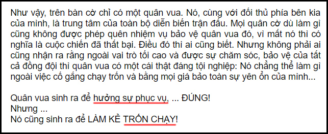 Nhìn chung tôi không có vấn đề gì với các bài dạy đong xèng và dạy self-help của giới con buôn và diễn giả, nhưng tôi không chấp nhận được họ lôi cờ vua vào để truyền bá kiến thức méo mó. Tôi tự hỏi phải chăng họ thiếu tự tin đến nỗi nếu không dẫn cờ vua vào thì lời nói không còn sức nặng chăng, và phải chăng họ thiếu dũng cảm đến mức không thể thú nhận trò cờ abc với đặc điểm xyz này do tôi hư cấu để minh hoạ cho quan điểm của mình, chứ nó không có thật đâu?